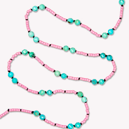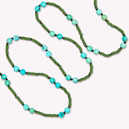 Minimalist design of faceted natural turquoise and Japanese glass beads. Hand-knotted on a luxurious black silk cord for contrast. Finished with a sterling silver clasp.